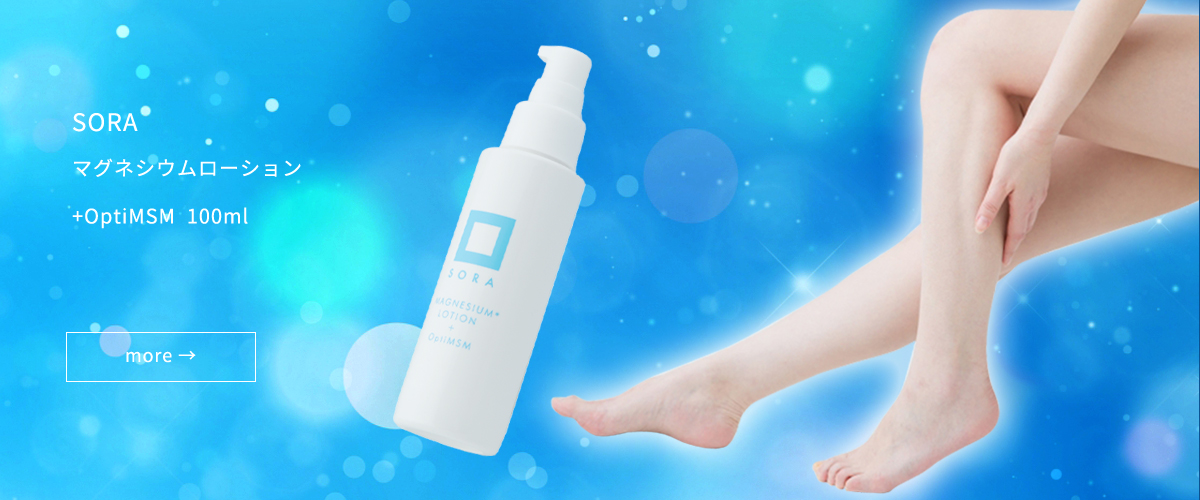 SORAマグネシウムローション+OptiMSM こんなときにおためしください 使用方法 一日2~4プッシュ程度を気になる部位(ふくらはぎや肩、膝など)に優しく、たたくように吸収させてください。(お顔には使用しないでください) 気になる部分に塗布後、20分程度で吸収されるので、べたつきなどが気になる方は、その後洗い流していただいても大丈夫です。 PRODUCT NEWS 2020.12.1 公式ブランドサイトがオープンしました。